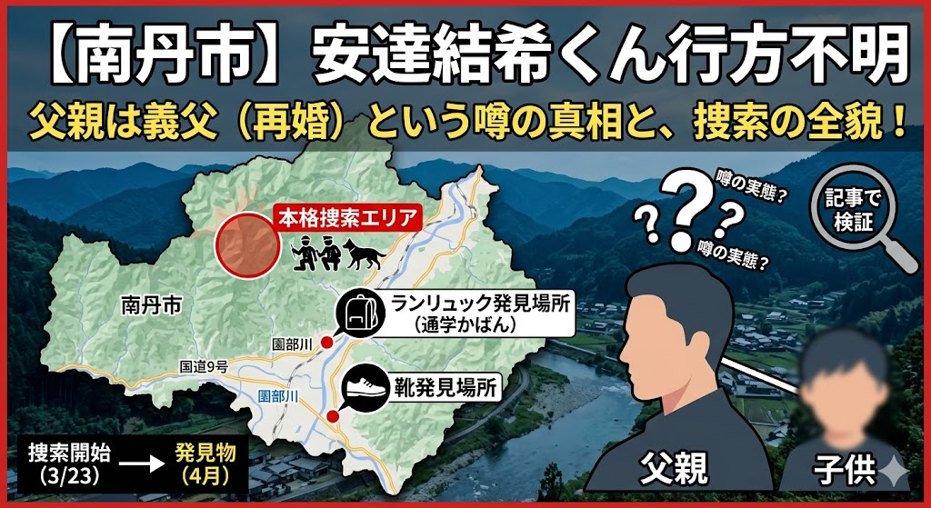 2026年3月23日、京都府南丹市で11歳の男の子が忽然と姿を消した。 父親が車で学校のすぐそばまで送り届けてから、わずか150メートルの距離で行方が途絶えた——。この事件で「父親はどんな人なのか」という疑問を持つ人が急増しています。 本記事では、報道... 事件